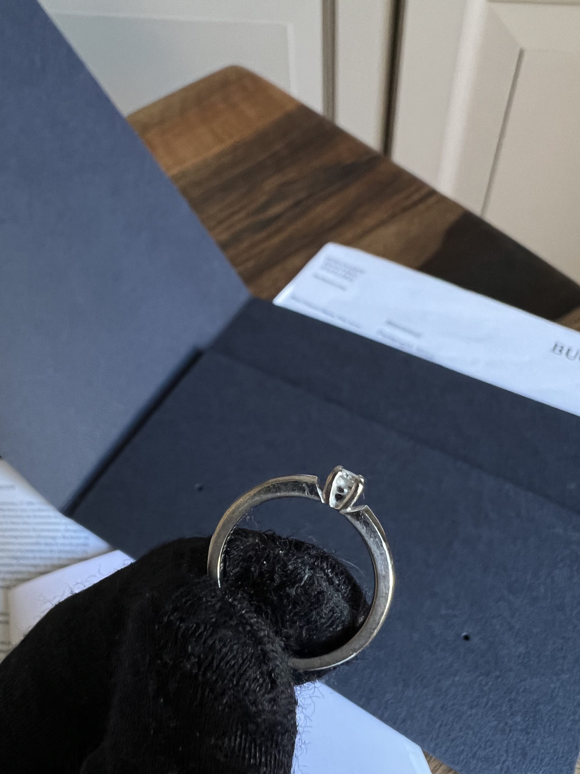 Bague solitaire or blanc 18k et diamant. de base pour une taille 53 mais a été ajustée pour une taille 49. Bon état général. Quelques rayures. Vendu avec papiers. Un écrin sera fourni.
