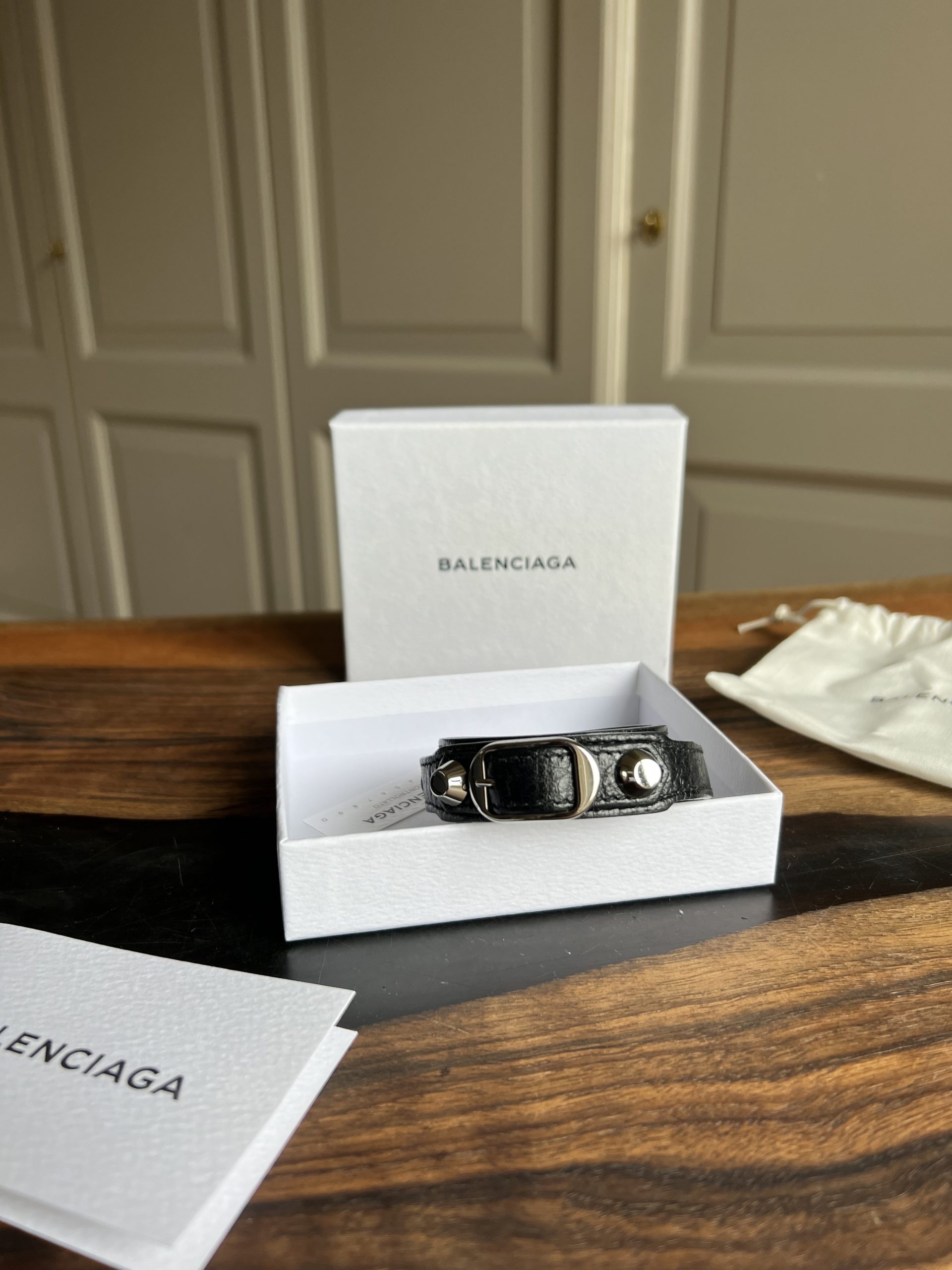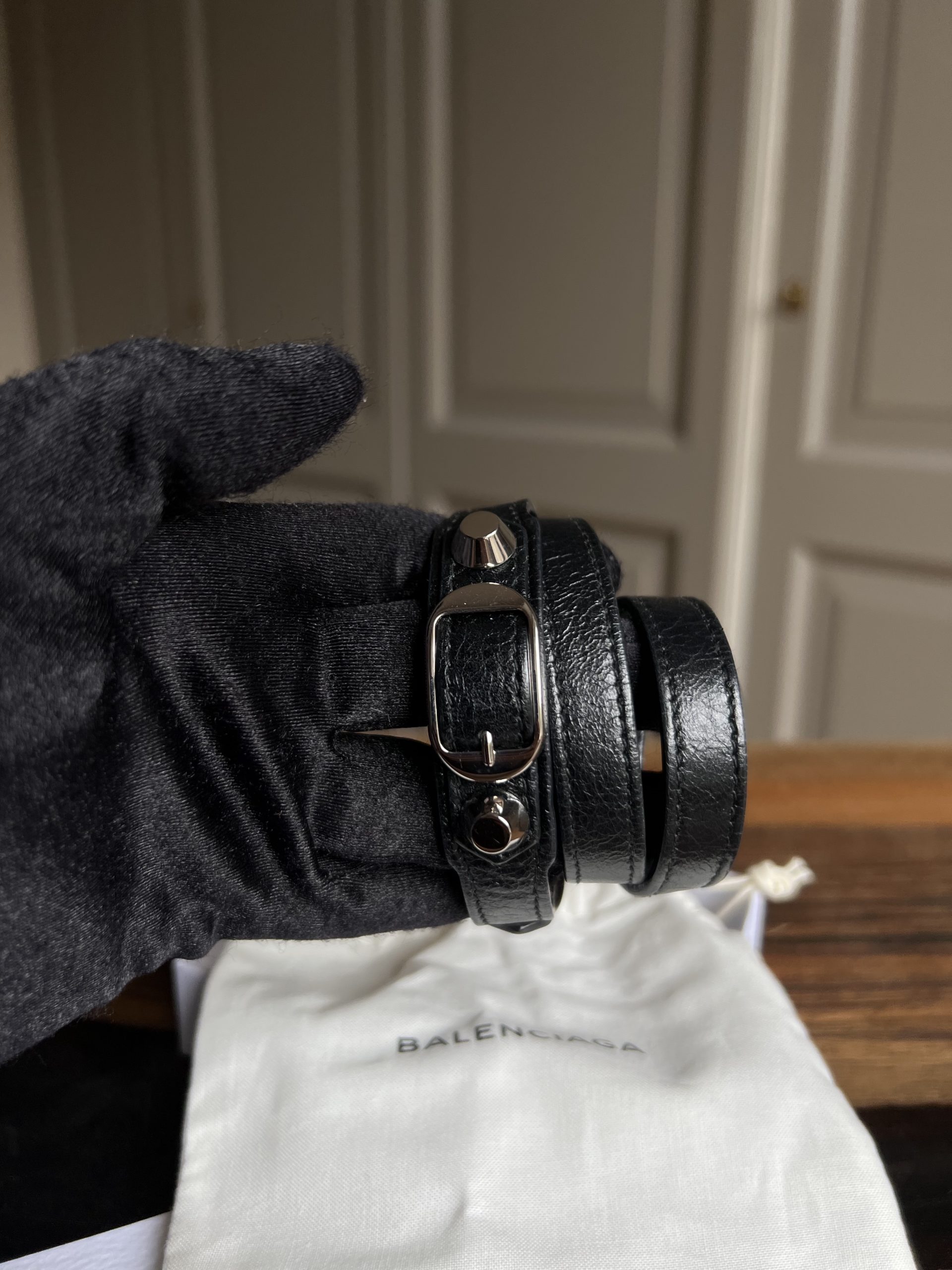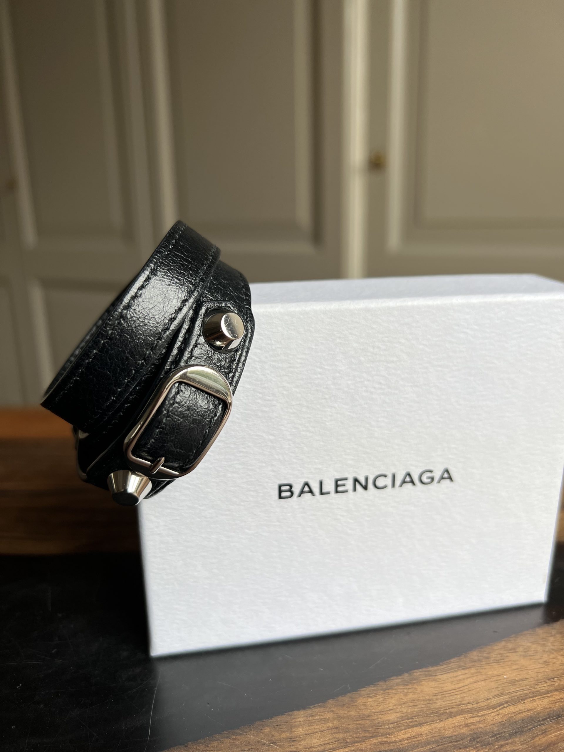 Bracelet Balenciaga en très bon état. Vendu avec pochette + boîte. Peut se mettre en double ou triple tour suivant poignet.
