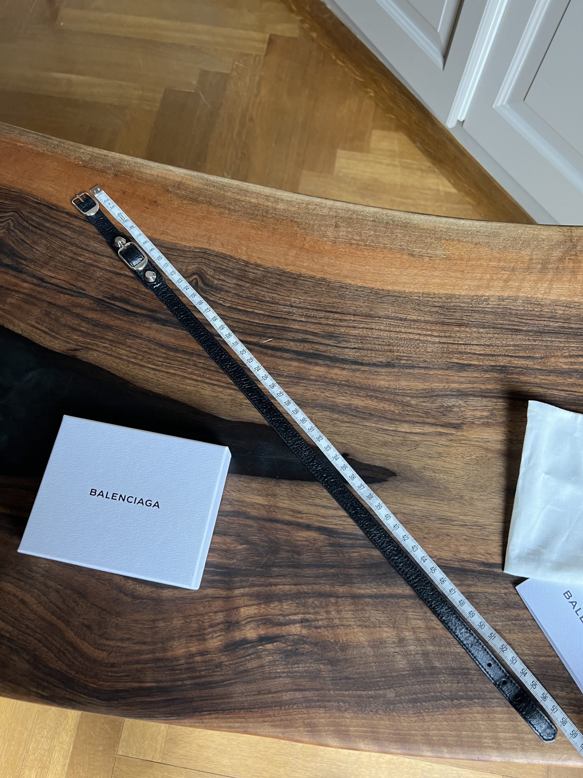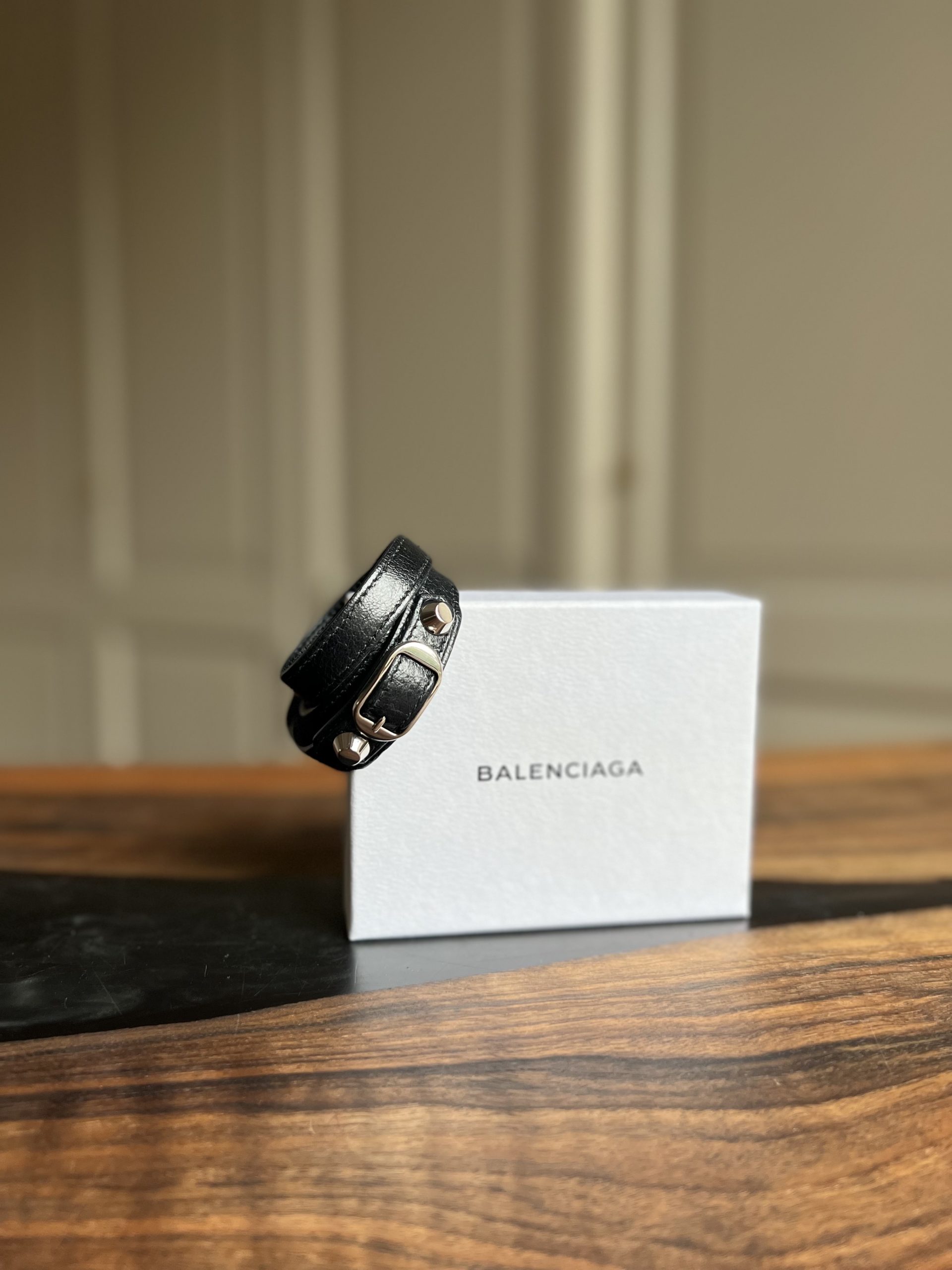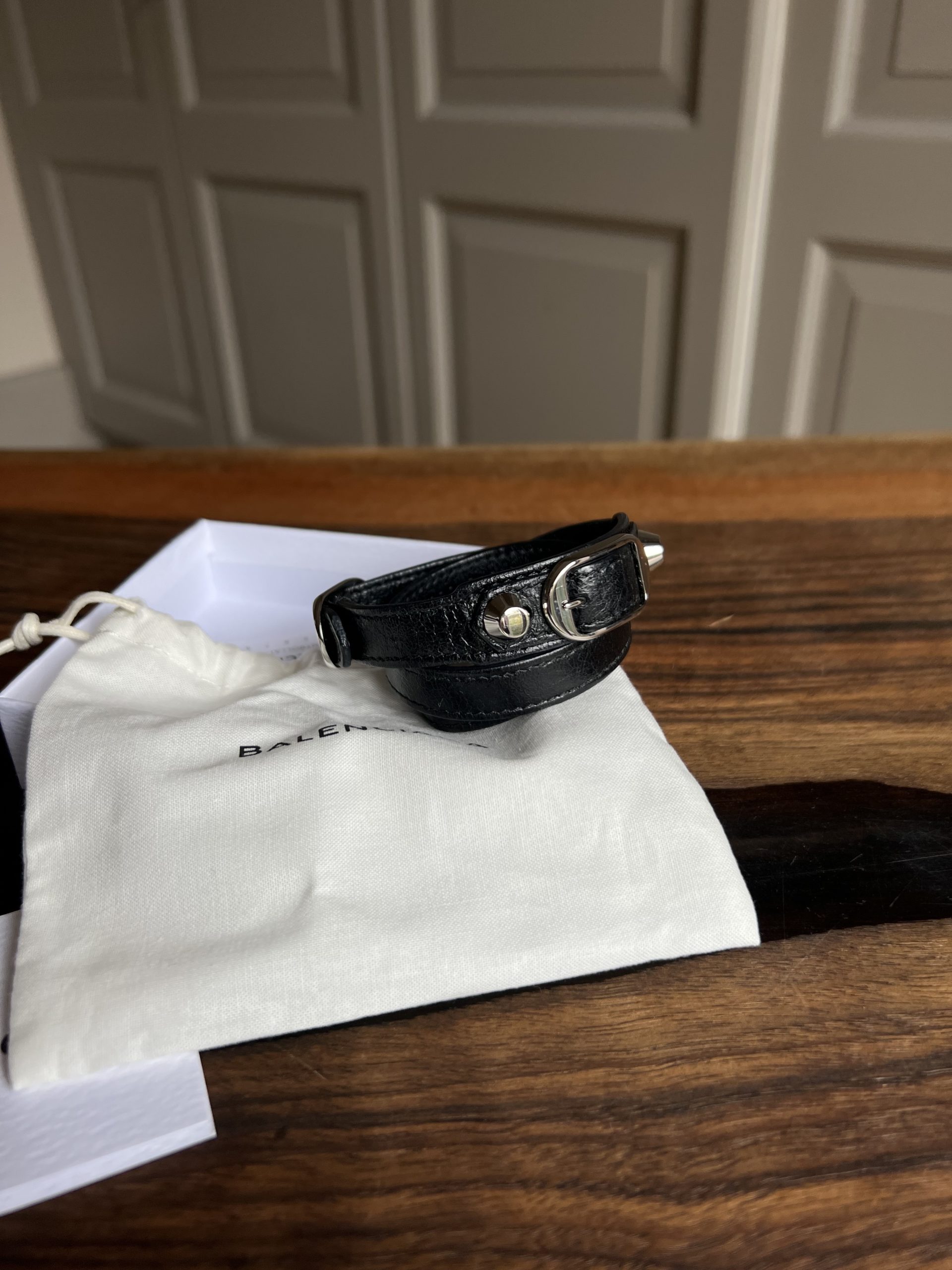 Bracelet Balenciaga en très bon état. Vendu avec pochette + boîte. Peut se mettre en double ou triple tour suivant poignet.