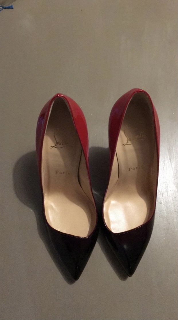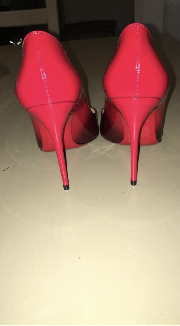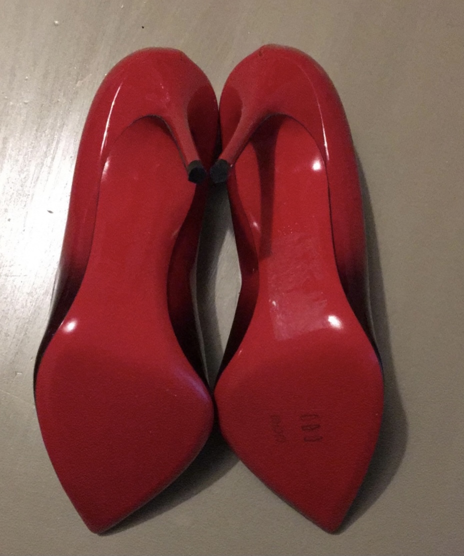 Escarpins neufs, jamais portés. Couleur rouge vernis avec la pointe noir. Je n’ai malheureusement plus la boîte.
