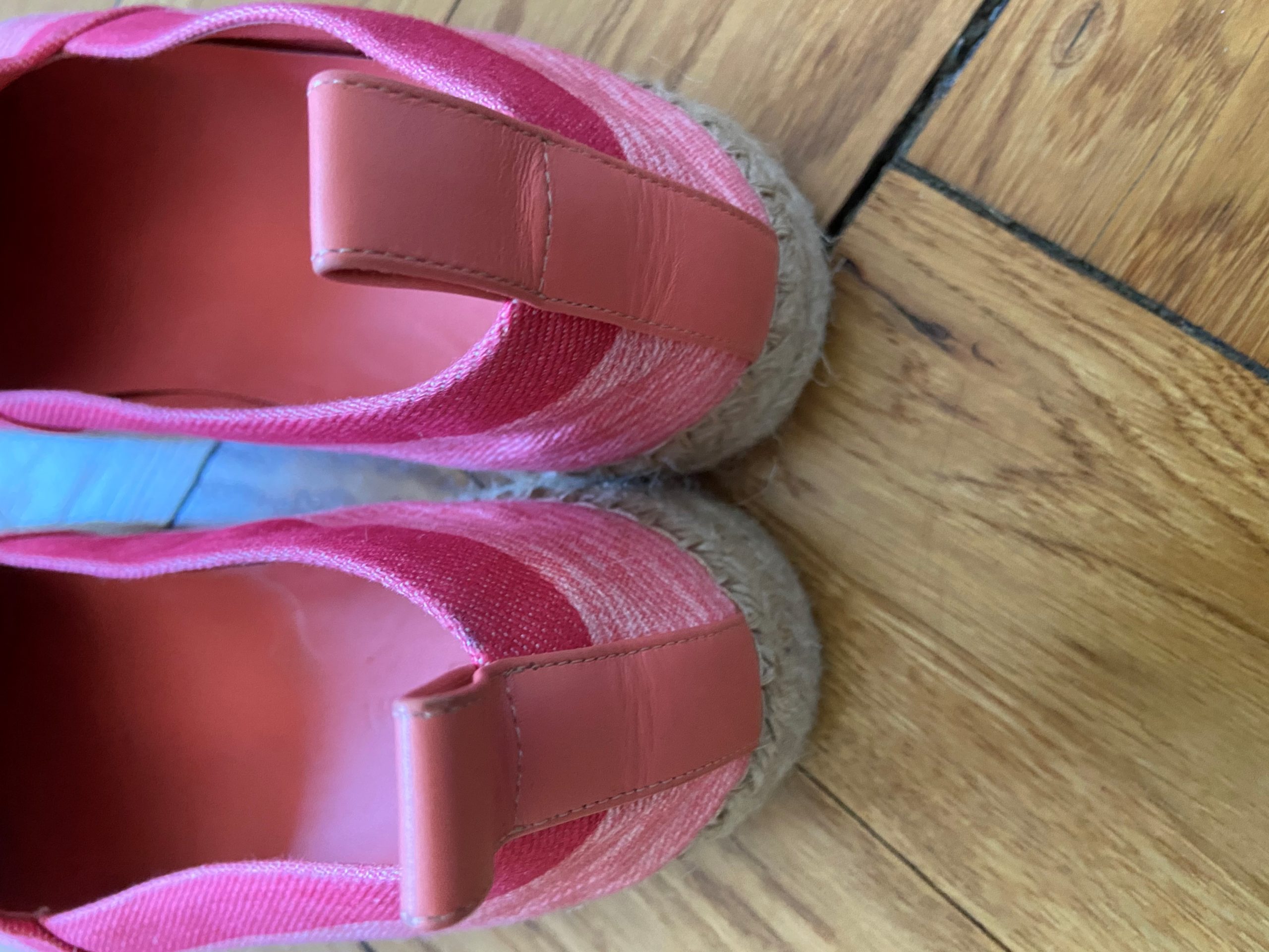 Mocassins/ espadrilles en toile et cuir couleur rose orangé. En très bon état car peu porté.