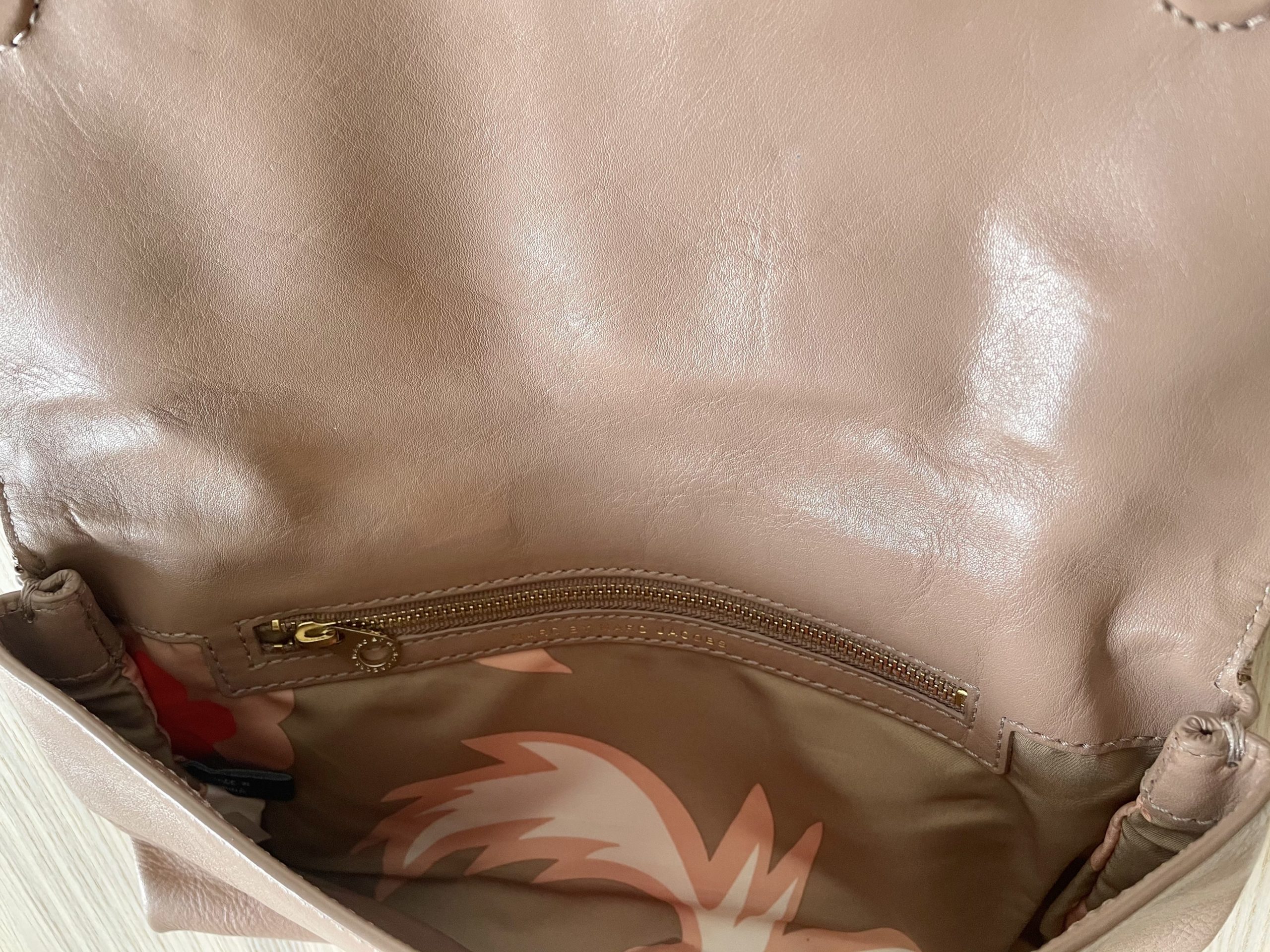 Pochette cuir beige Marc Jacobs. Fermeture magnétique. Petite poche à fermeture supplémentaire. Taille: 27 x 14 cm. Portée 1-2 fois, en condition parfaite. Vient avec une pochette Marc Jacobs.