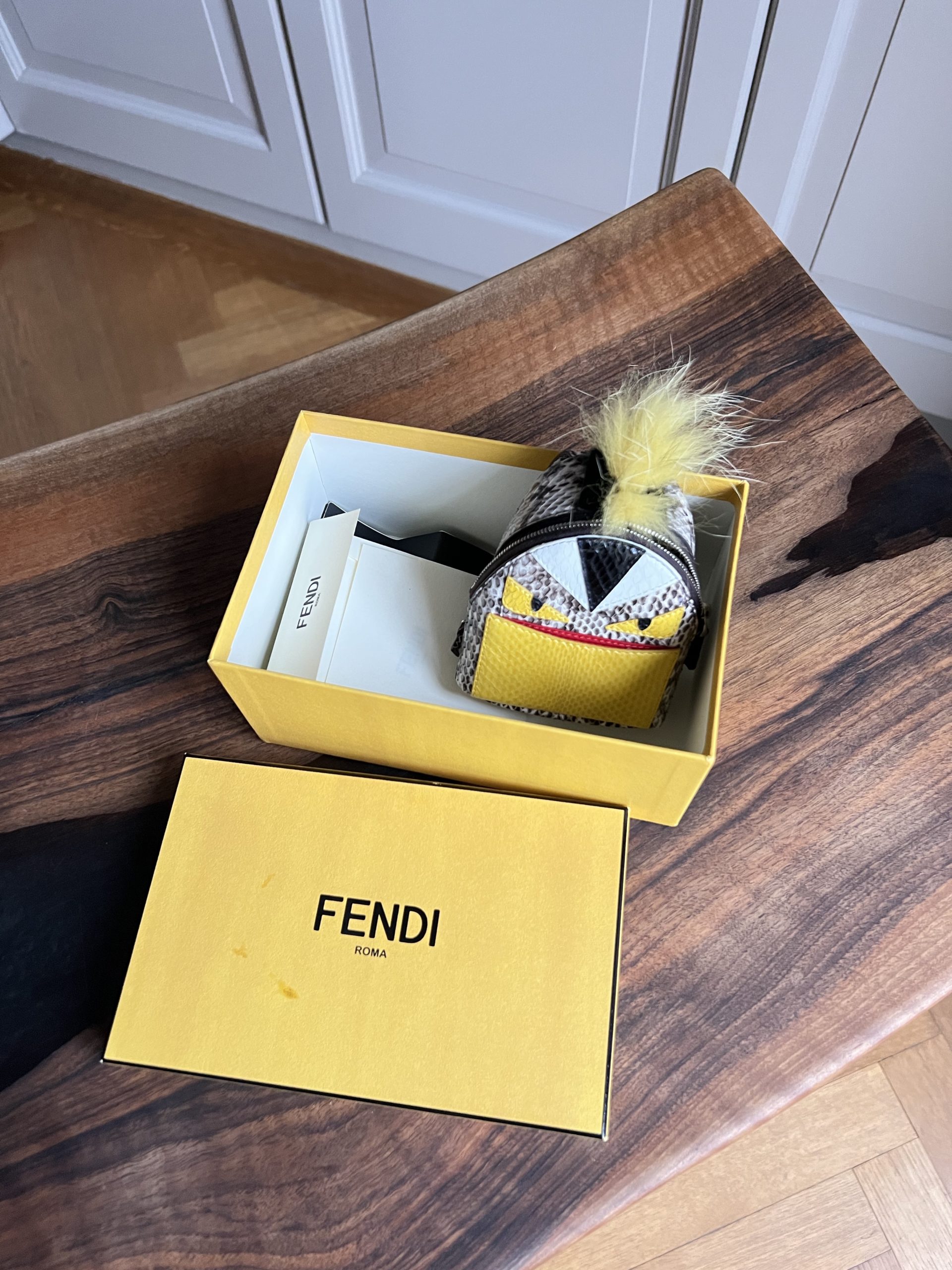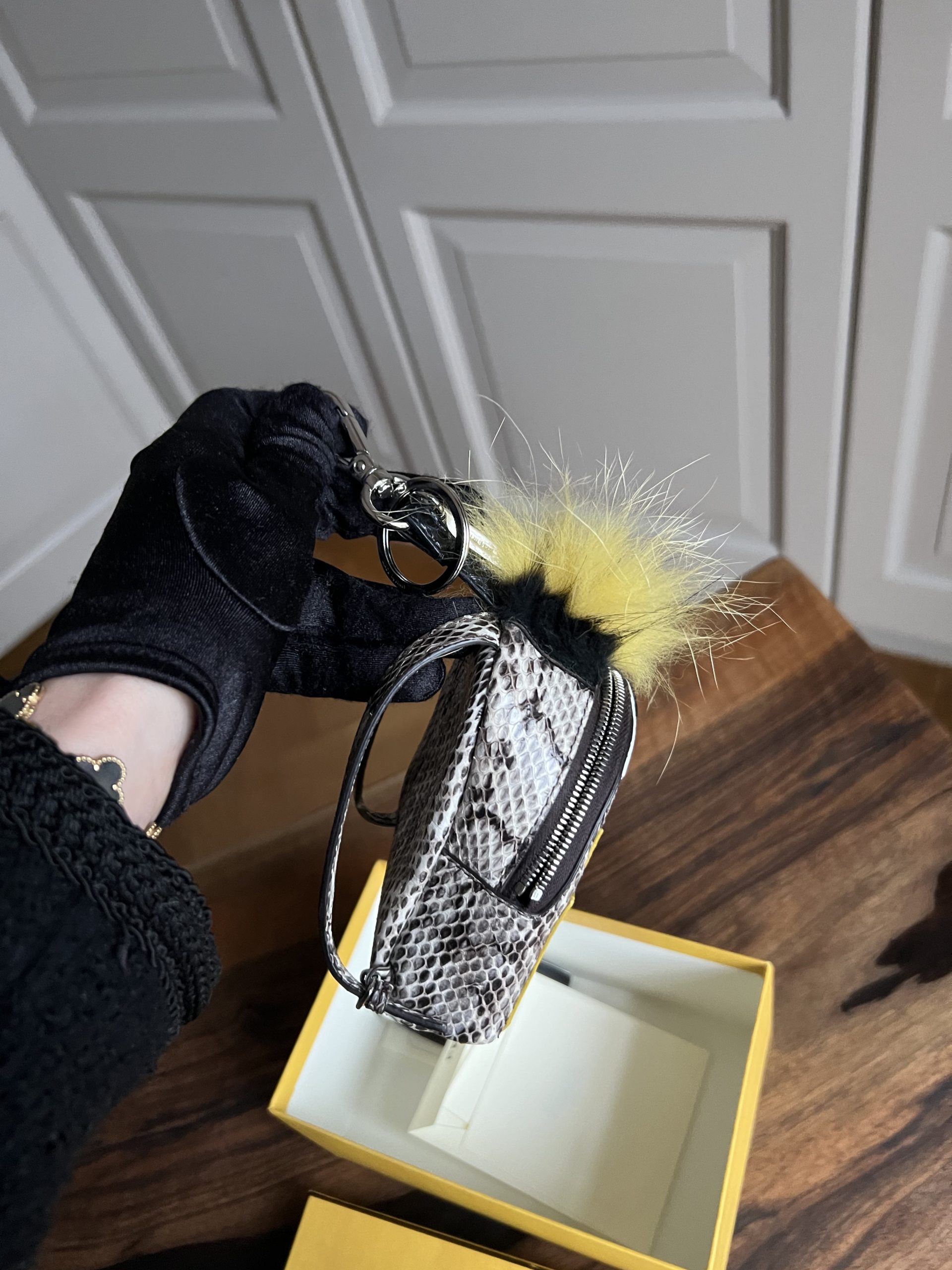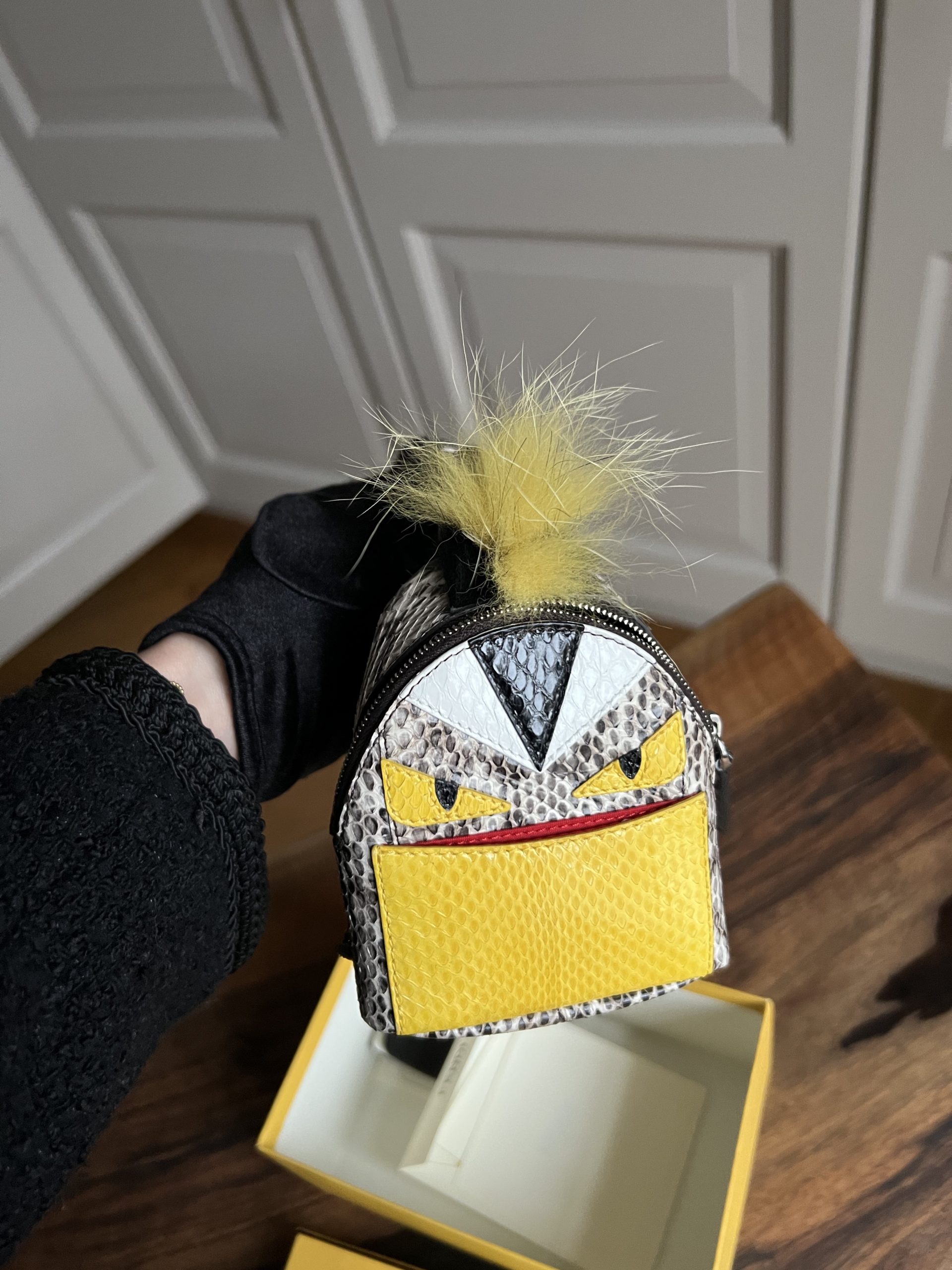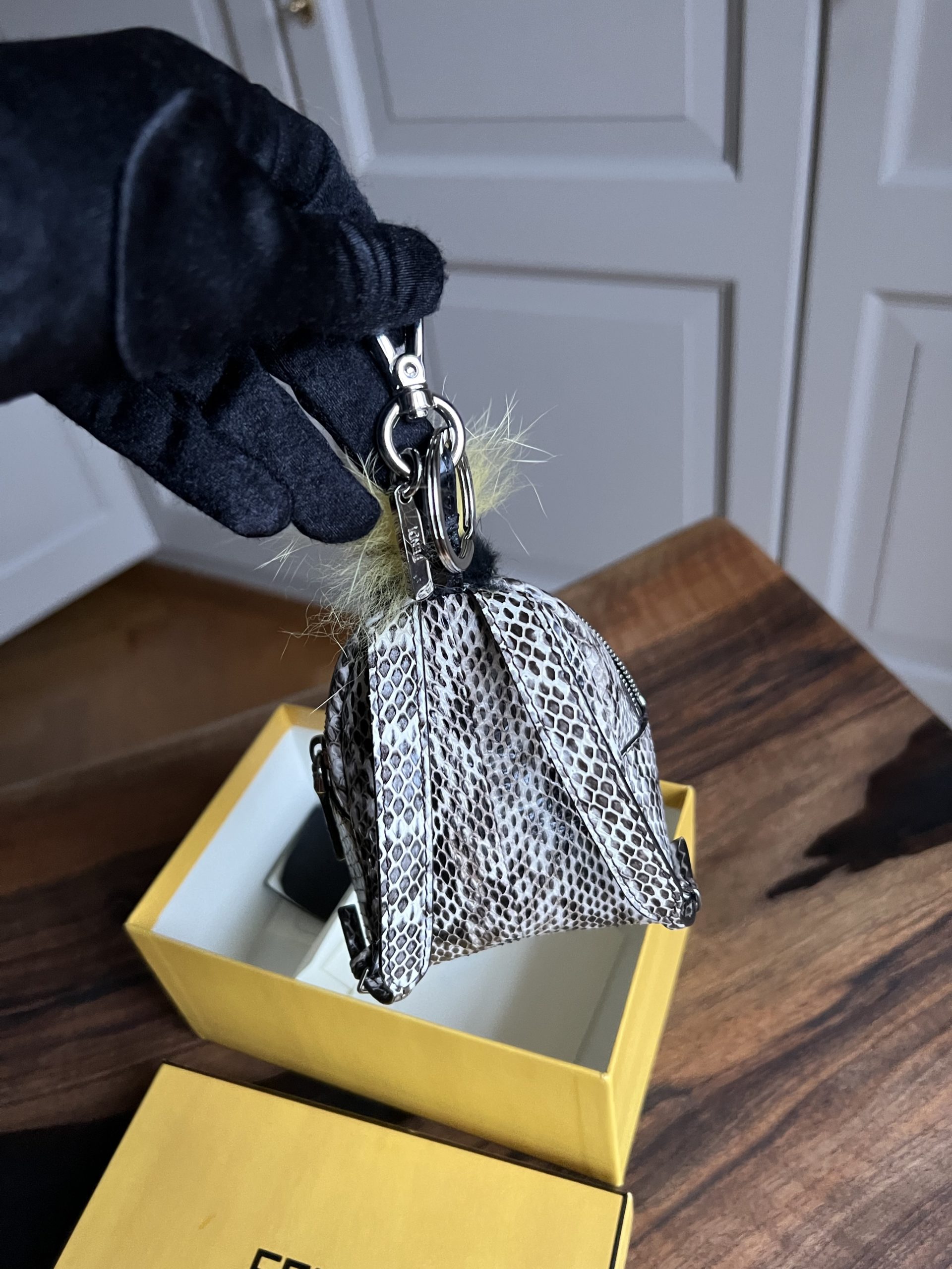 Porte-clés sac à dos Fendi en python et fourrure. Vendu avec boîte.