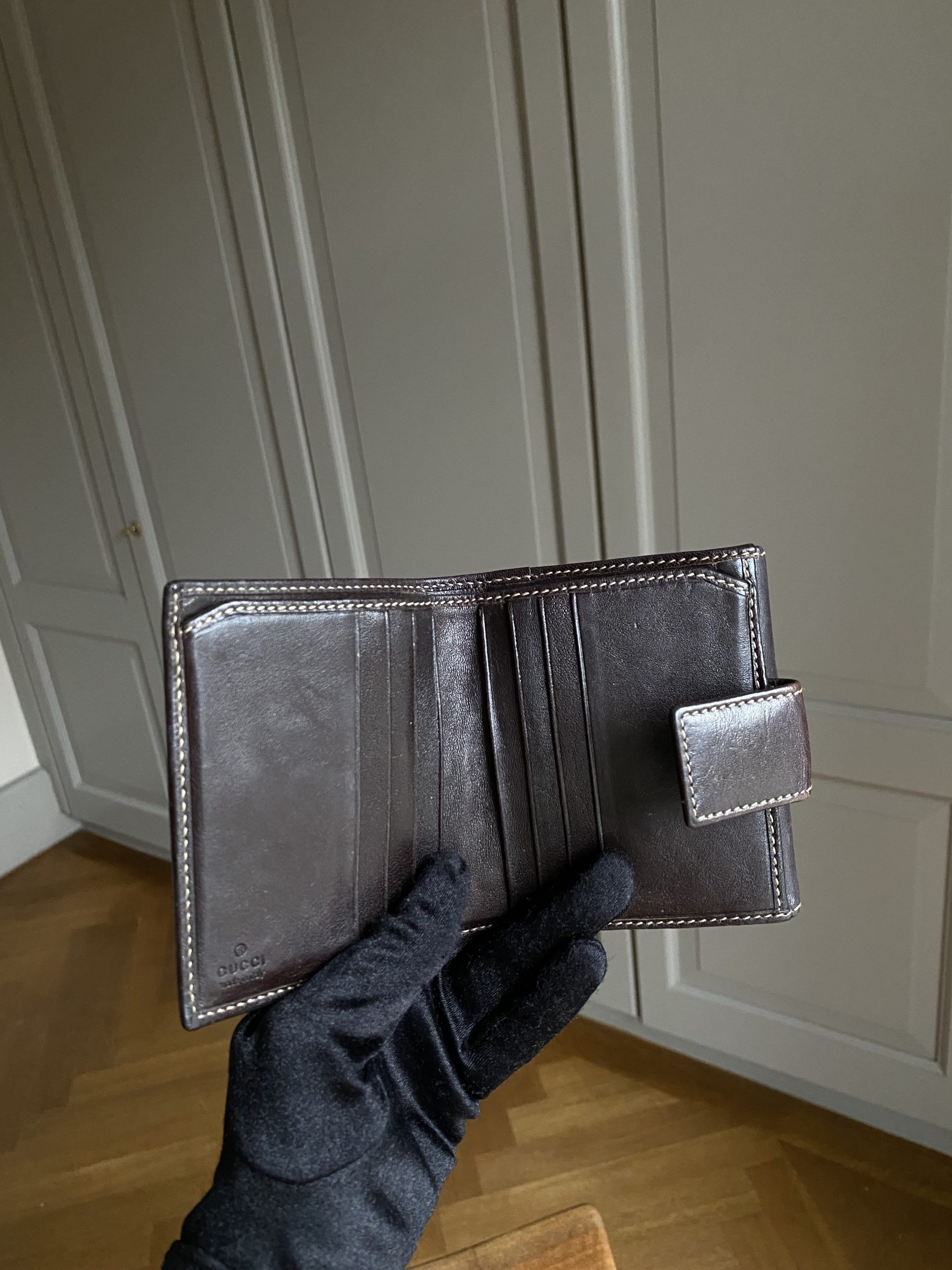 Porte-monnaie Gucci en bon état. Faibles traces d’usure (cuir légèrement patiné).