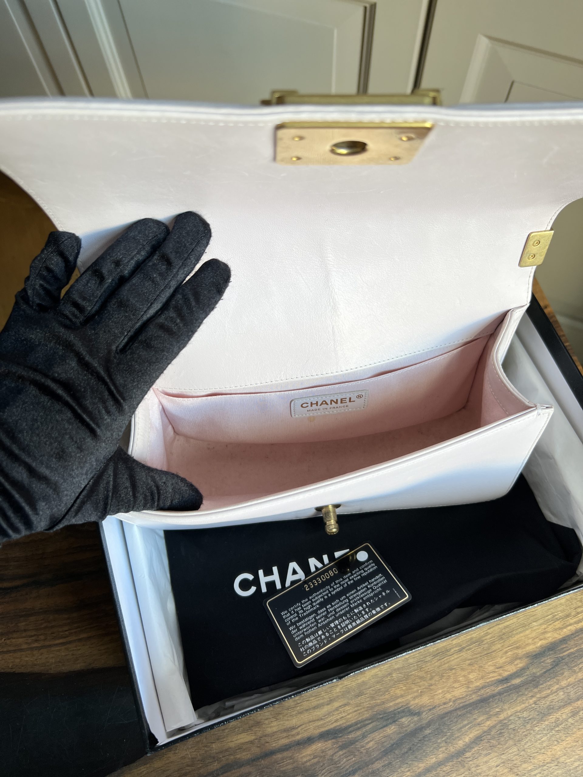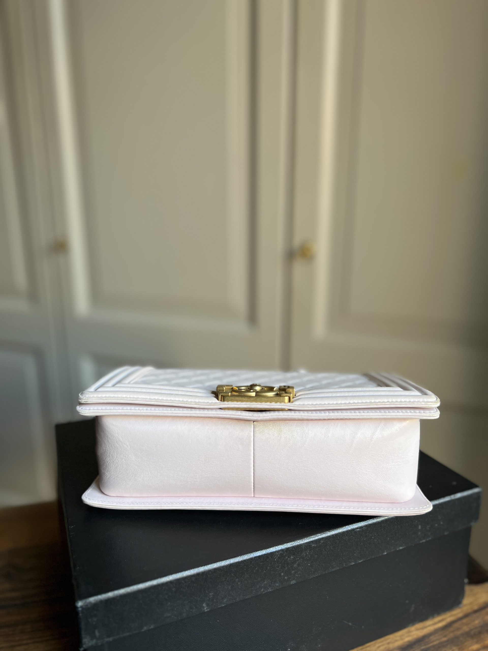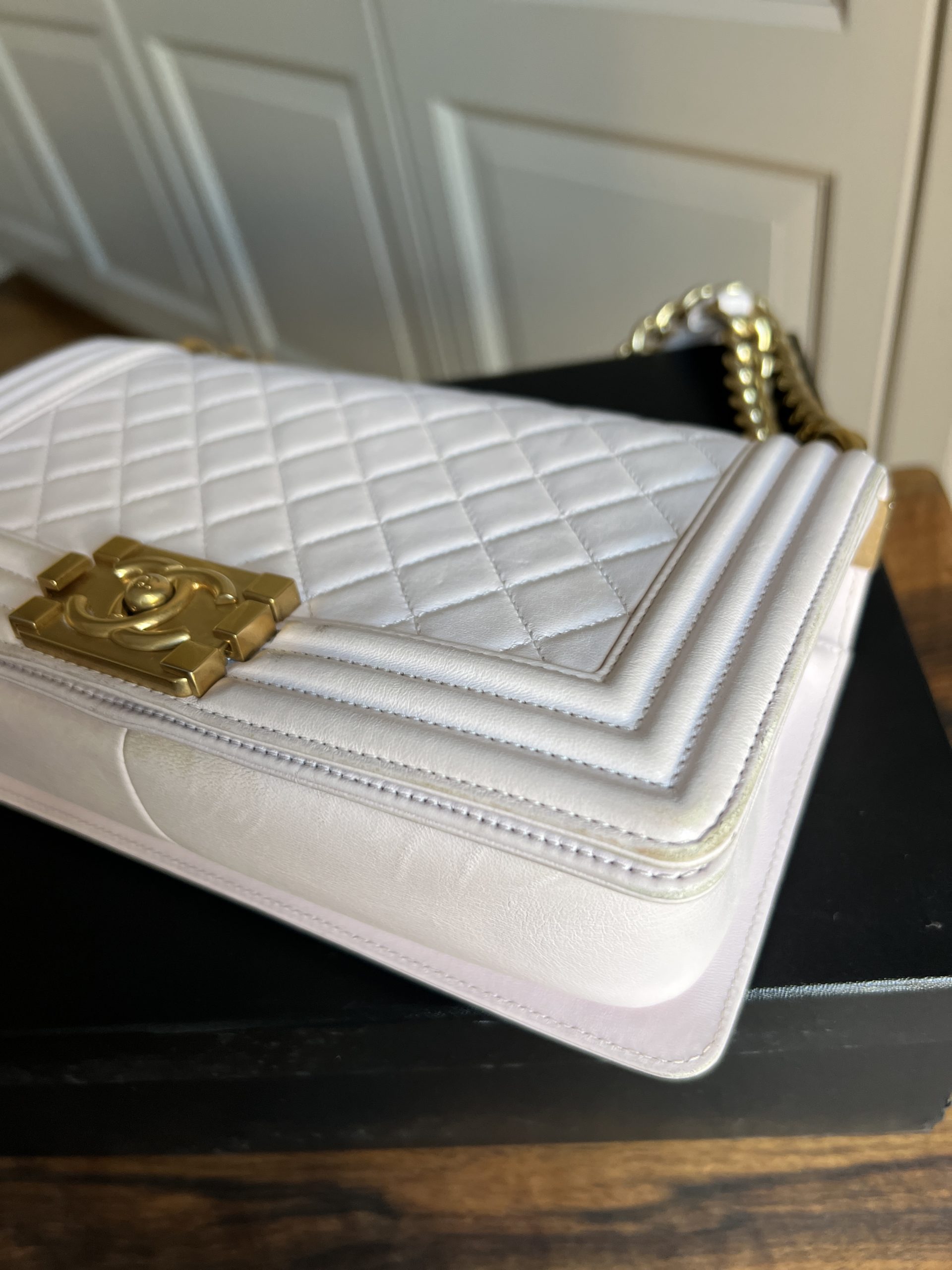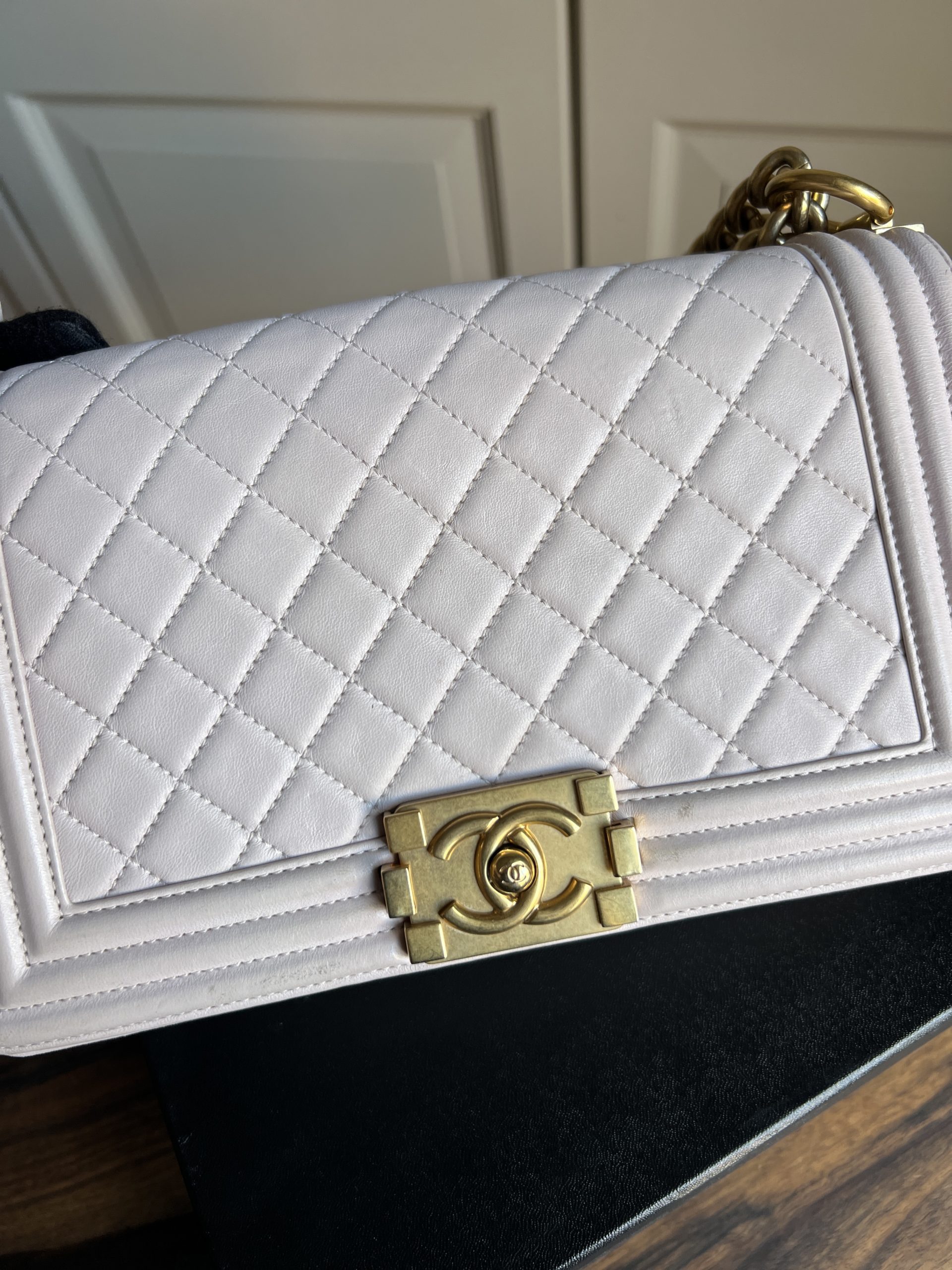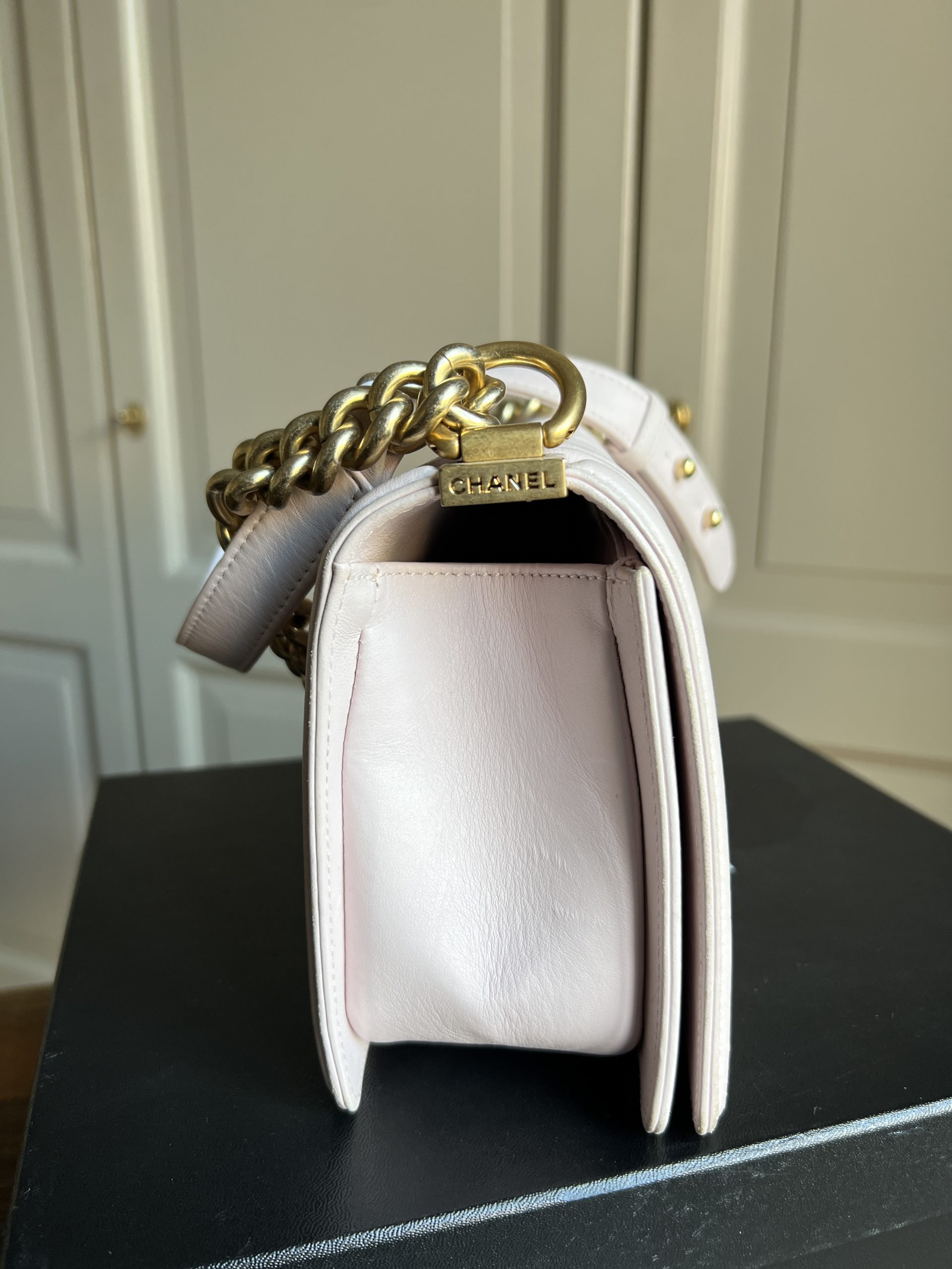 Sac Chanel boy. Cuir lisse. Quelques (faibles) traces/tâches. Vendu avec boîte, carte d’authenticité + dustbag.