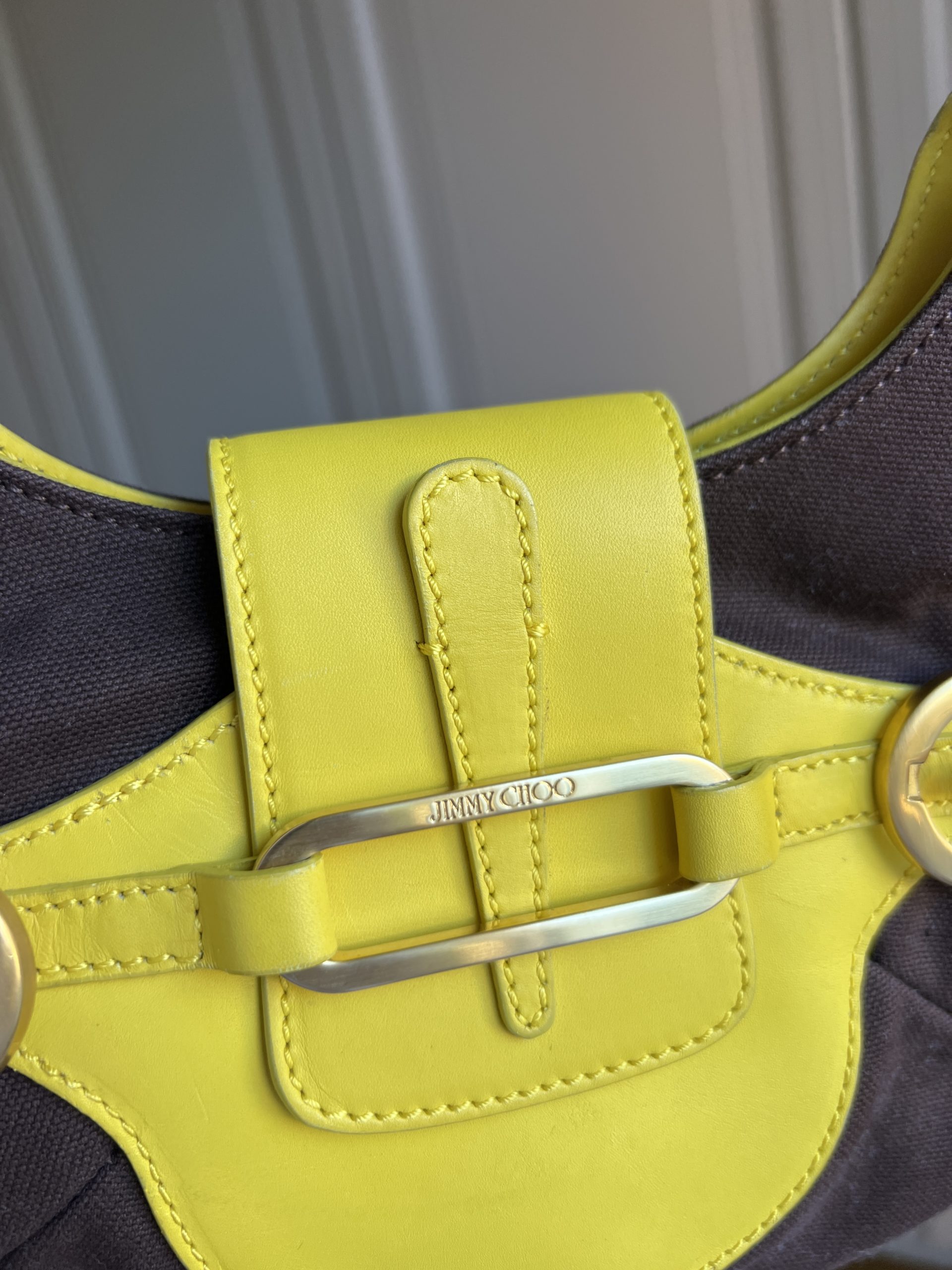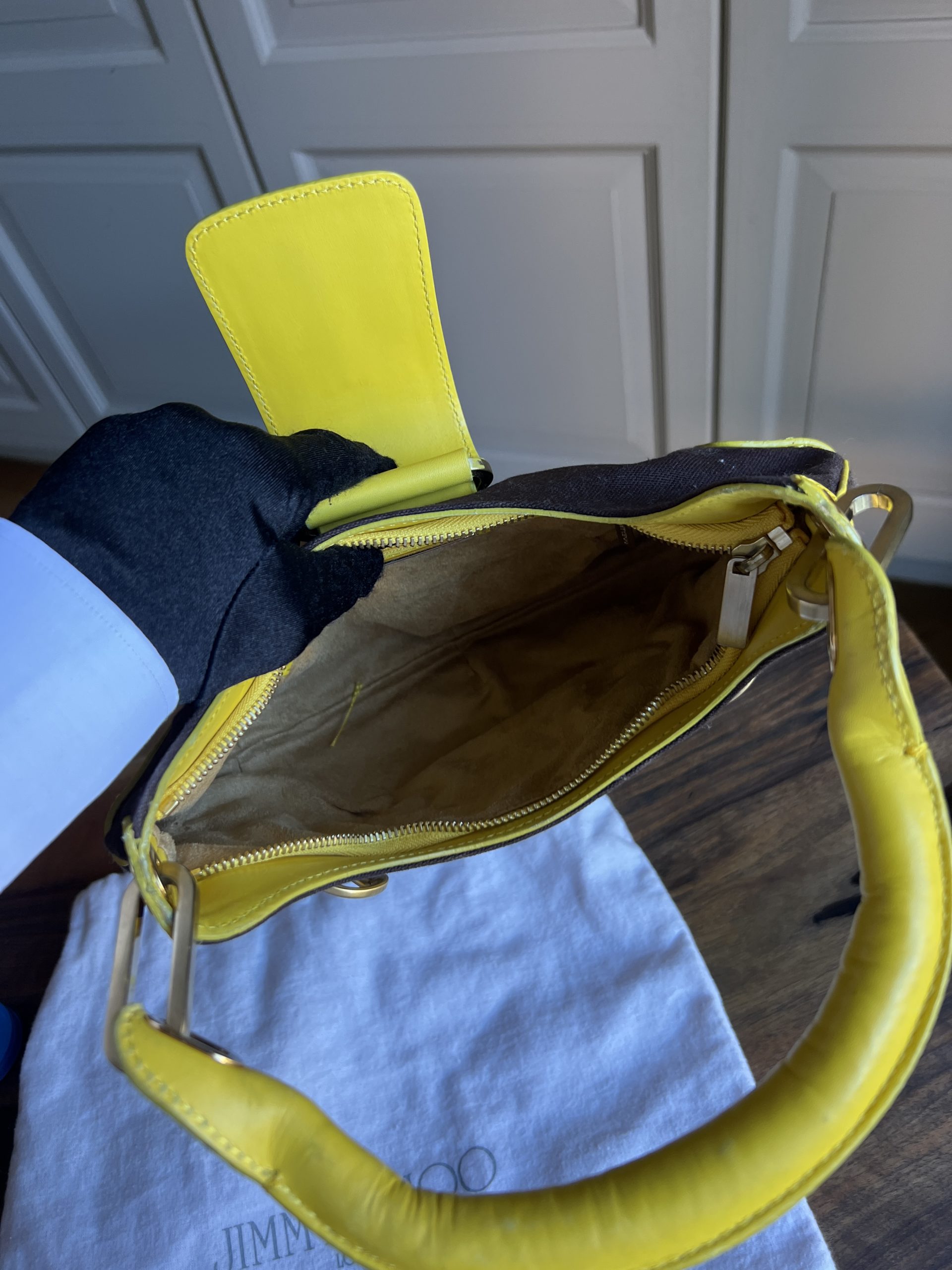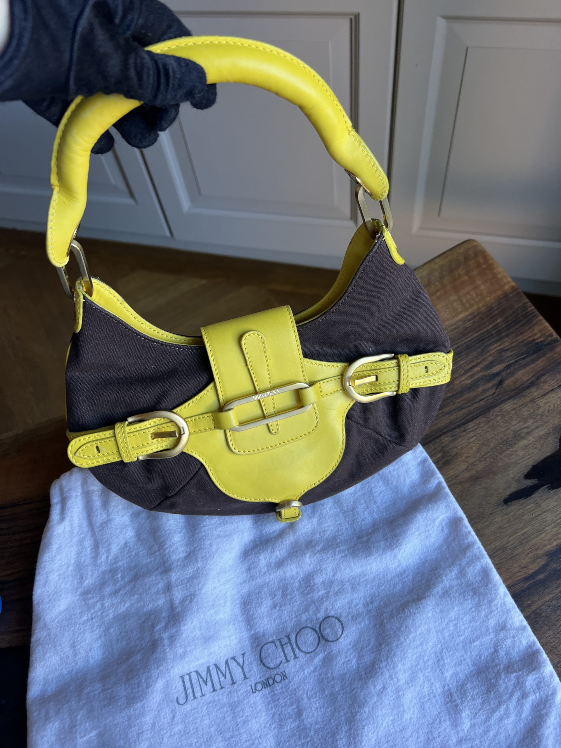 Sac Jimmy Choo en bon état. Tissu et cuir. Vendu avec dustbag.